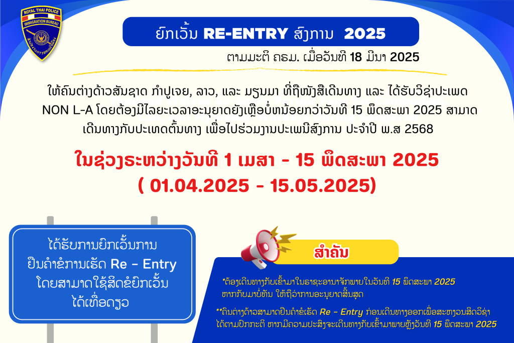 ทั้งนี้ คนต่างด้าวสามารถยื่นคำขอทำ Re-Entry ก่อนเดินทางออกเพื่อสงวนสิทธิ์วีซ่าได้ตามปกติ หากประสงค์จะเดินทางกลับเข้ามาภายหลังวันที่ 15 พ.ค.68
