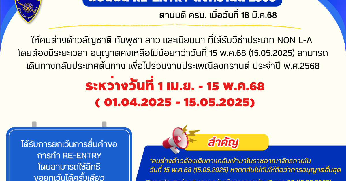 ทั้งนี้ คนต่างด้าวสามารถยื่นคำขอทำ Re-Entry ก่อนเดินทางออกเพื่อสงวนสิทธิ์วีซ่าได้ตามปกติ หากประสงค์จะเดินทางกลับเข้ามาภายหลังวันที่ 15 พ.ค.68